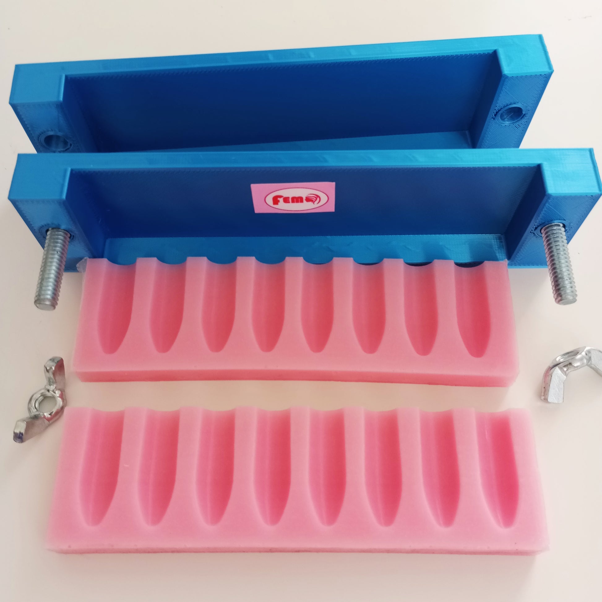 Molde para fabricación de óvulos o supositorios (8 óvulos) en silicona con estructura desmontable para fácil extracción y limpieza. Para ovulos de 2.15 Gr. 31 mm de alto y 9 mm de diámetro.